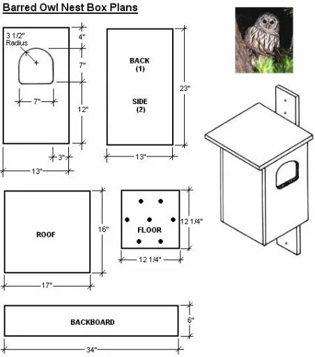 Construction is simple. Use exterior plywood if the box is to be placed in an exposed situation. Approximately nine drain holes, 1/4 to 1/2 inch in diameter, should be spaced throughout the bottom. Cover the bottom with 1 or 2 inches of wood shavings, as barn owls place no nest material.